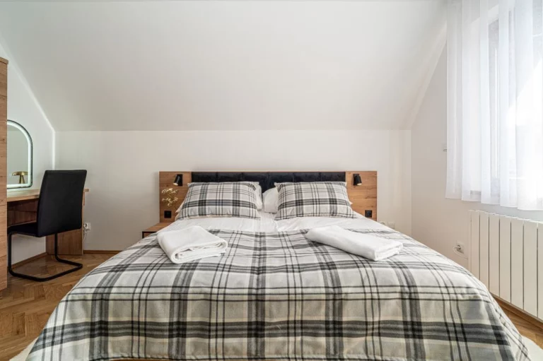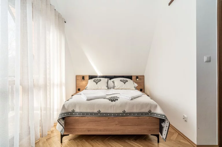 Sypialnia II: łoże małżeńskie, dwa stoliki nocne z oświetleniem, szafa, biurko z krzesłem, wyjście na balkon.
