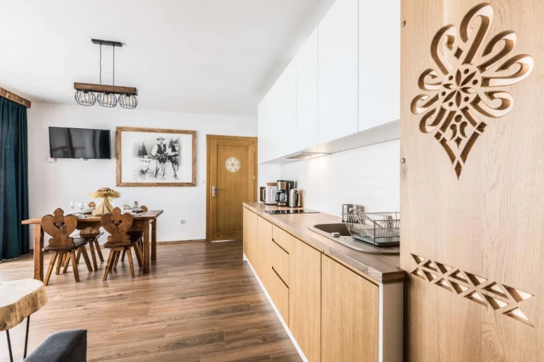 Wyjątkowa aranżacja wnętrza pomogła w stworzeniu klimatycznego miejsca. Połącznie nowoczesnego stylu oraz drewnianych tradycyjnych dodatków sprawia, że apartament jest przytulny oraz funkcjonalny.