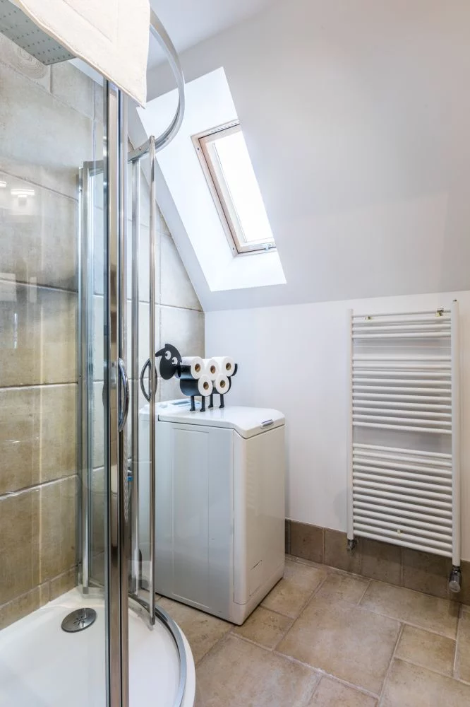 Łazienka: prysznic, WC, umywalka, szafka na kosmetyki, lustro, grzejnik ręcznikowiec, pralka, suszarka do włosów.