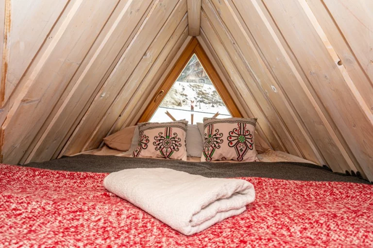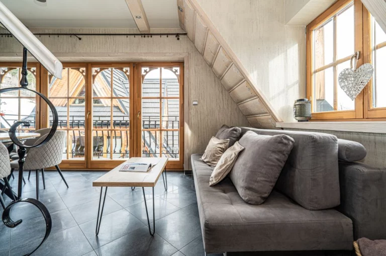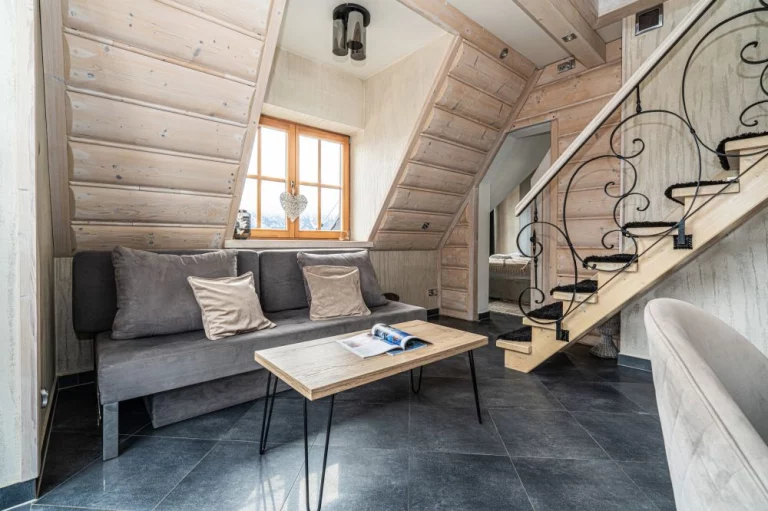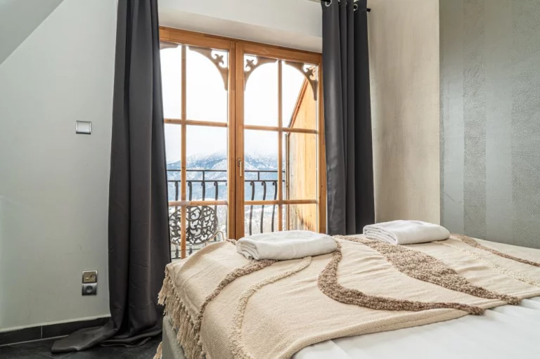 Przytulny dwupoziomowy apartament w stylu Zakopiańskim o powierzchni 55 m2 składa się z salonu połączonego z kuchnią, dwóch sypialni oraz łazienki. W salonie i sypialni jest wyjście na balkon, z którego roztaczają się piękne widoki na Tatry.