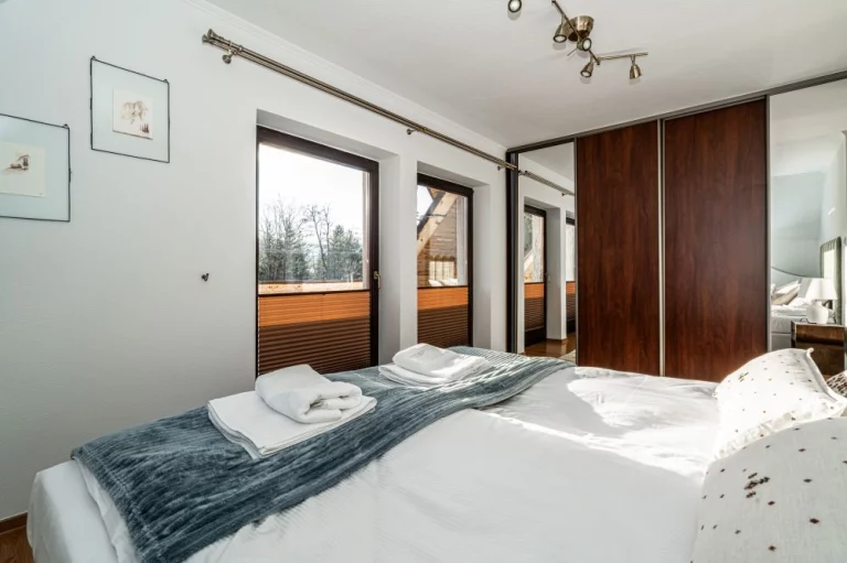 Sypialnia II: łoże małżeńskie, stoliki nocne z oświetleniem, szafa, wyjście na balkon