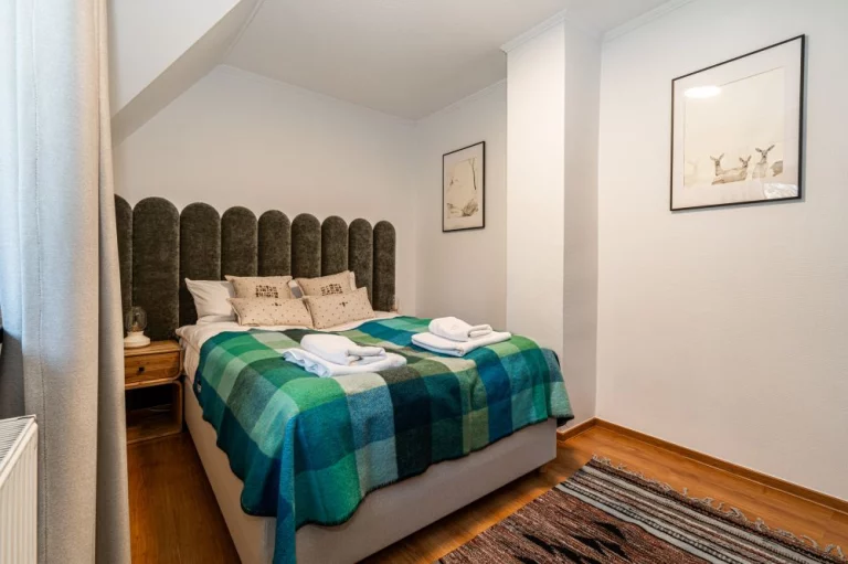 Czteropoziomowy apartament o powierzchni 200m2 przeznaczony jest dla 9 osób. Składa się z kuchni, salonu z wyjściem na taras, 4 sypialni oraz 3 łazienek. Na poziomie -1 znajduje się sauna fińska, bawialnia dla dzieci. Z tarasu znajduje się zejście do dużego ogrodu. Miejsce postojowe dla Gości znajduje się obok obiektu.