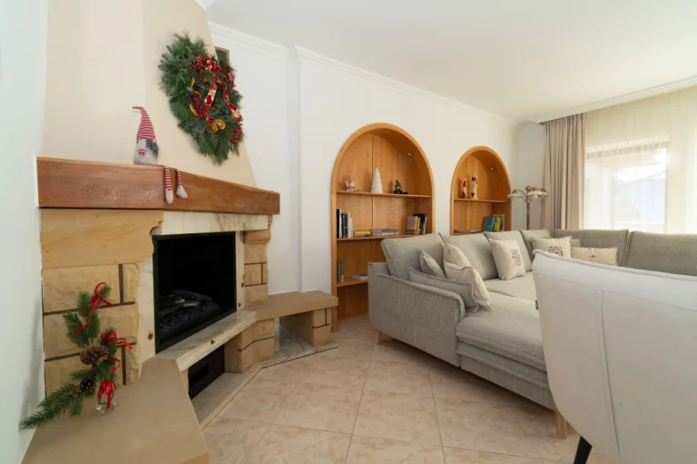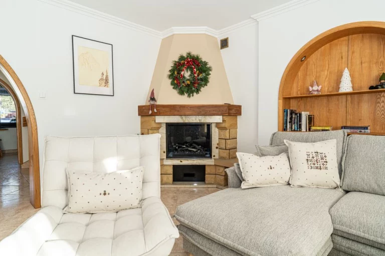 Salon: komoda, rozkładany dwuosobowy narożnik, dwa fotele, stolik kawowy, TV, kominek elektryczny, wyjście na taras.
