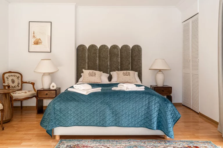Sypialnia I: łoże małżeńskie, stoliki nocne z oświetleniem, szafy, dwa krzesła z stolikiem, toaletka, wyjście na balkon.