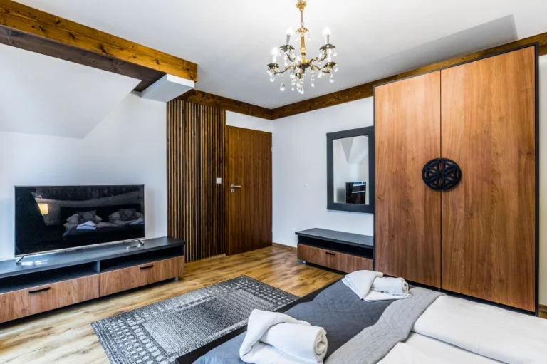 Przytulny apartament z akcentami Stylu Zakopiańskiego oraz drewna o powierzchni 41 m2 składa się z salonu połączonego z kuchnią, sypialni, przedpokoju oraz łazienki. W sypialni jest wyjście na balkon.