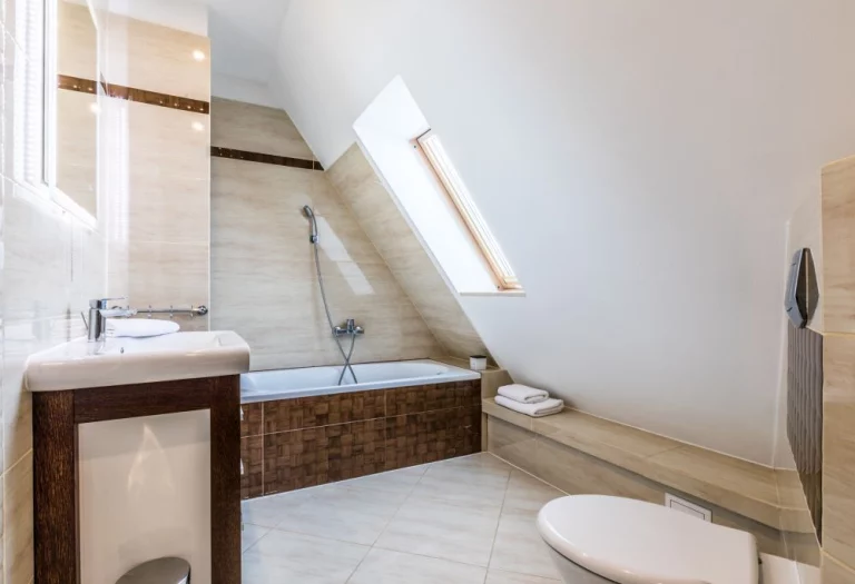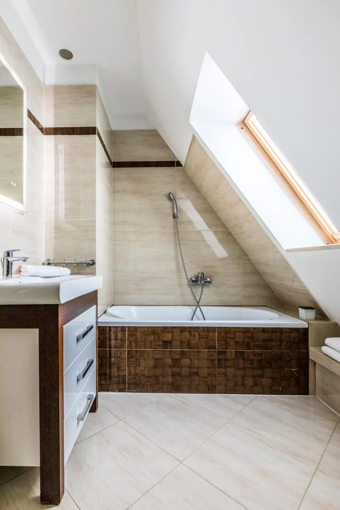 Łazienka: wanno-prysznic, WC, umywalka, szafka na kosmetyki, lustro, grzejnik ręcznikowiec, suszarka do włosów.