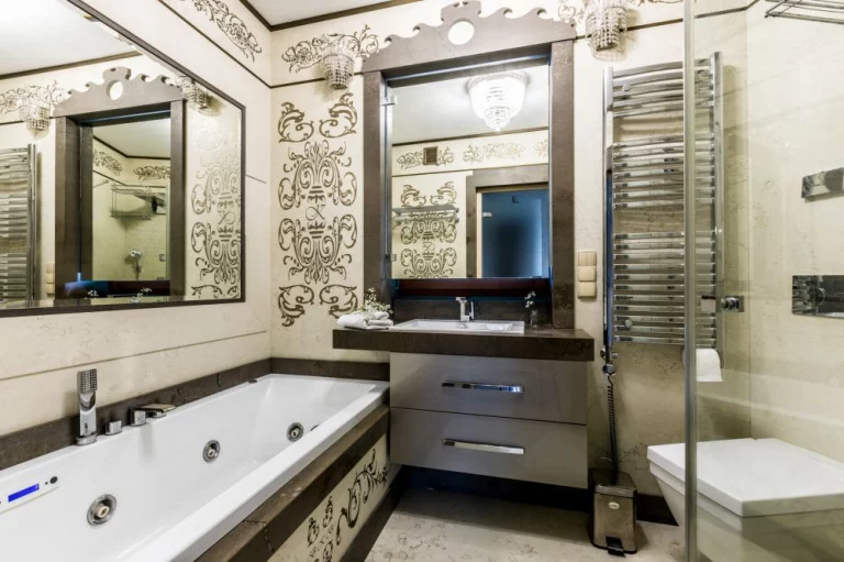 Łazienka: wanna z hydromasażem, prysznic, WC, umywalka, szafka na kosmetyki, lustro, grzejnik ręcznikowiec, suszarka do włosów.