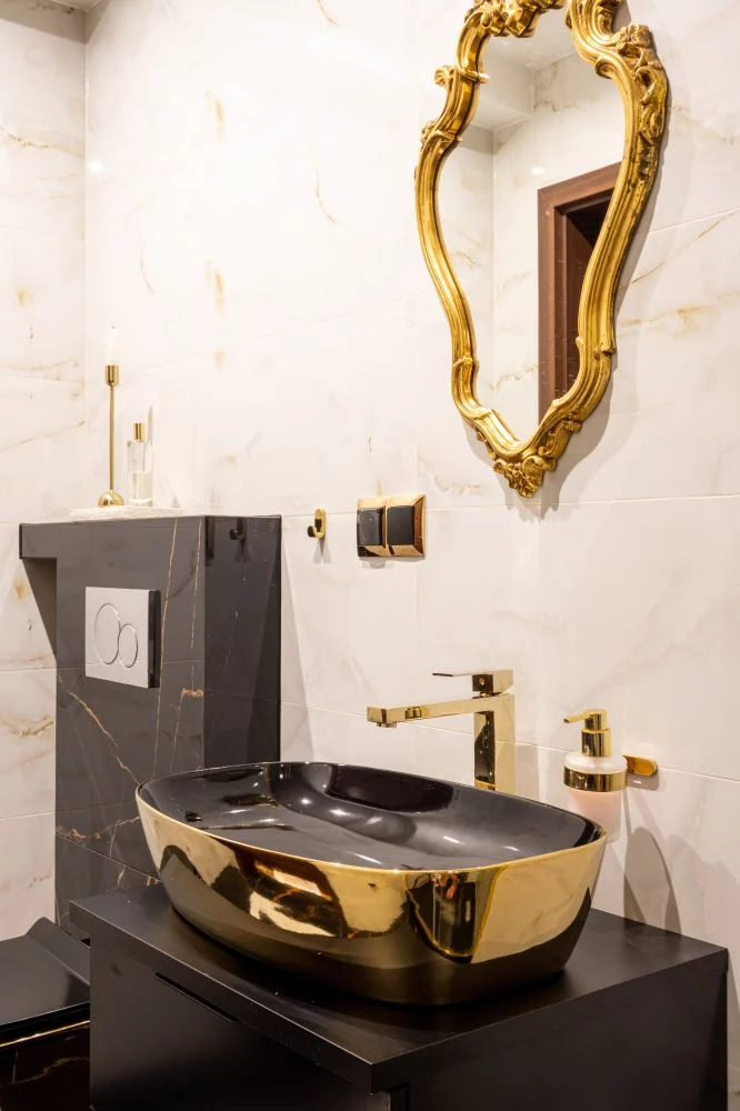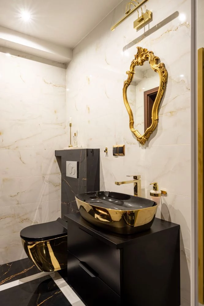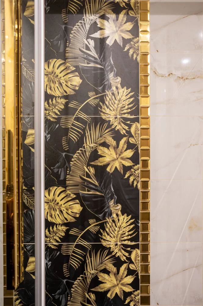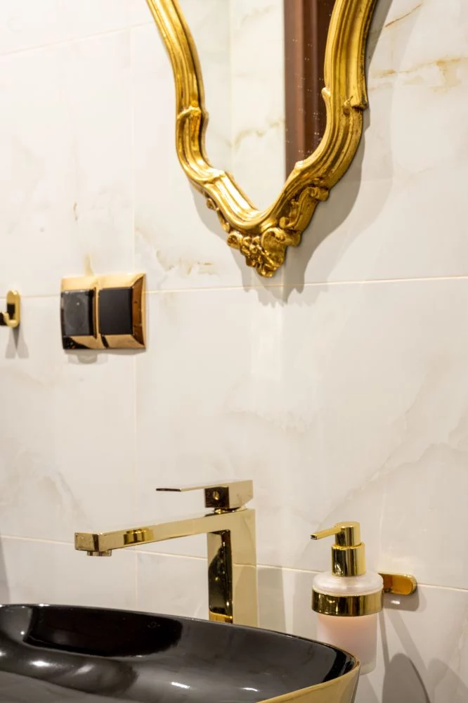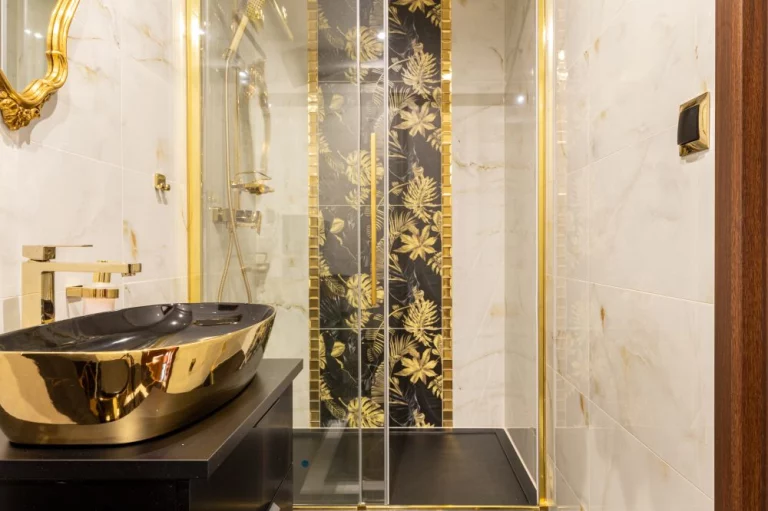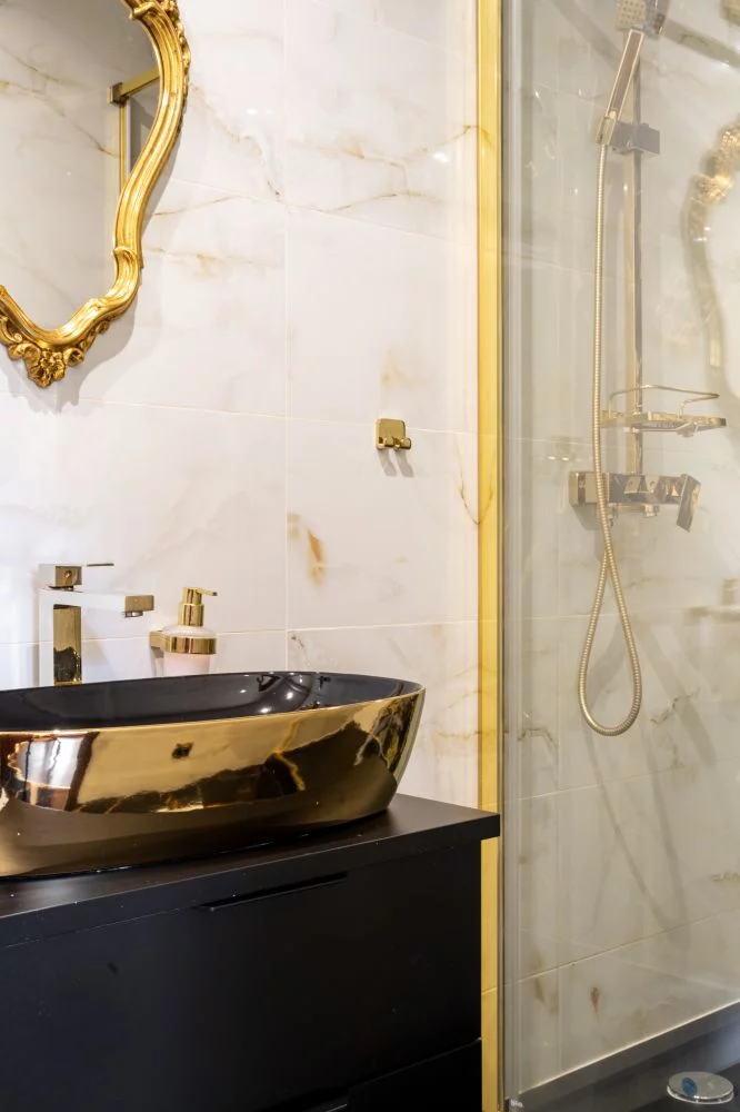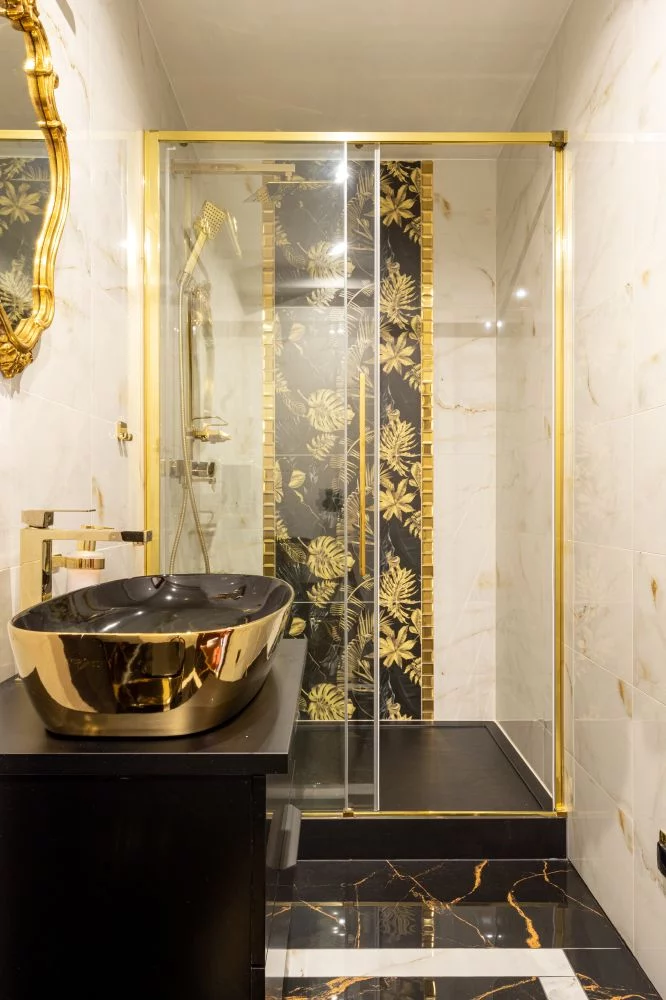W apartamencie jest piękna złota łazienka w stylu glamour z prysznicem.