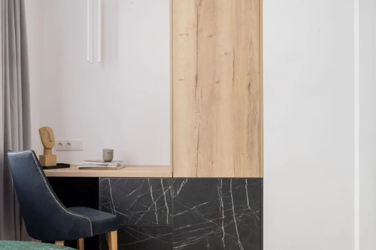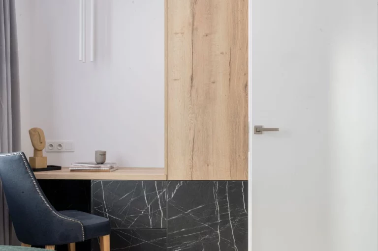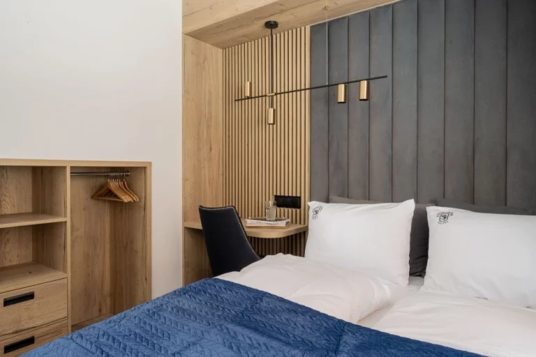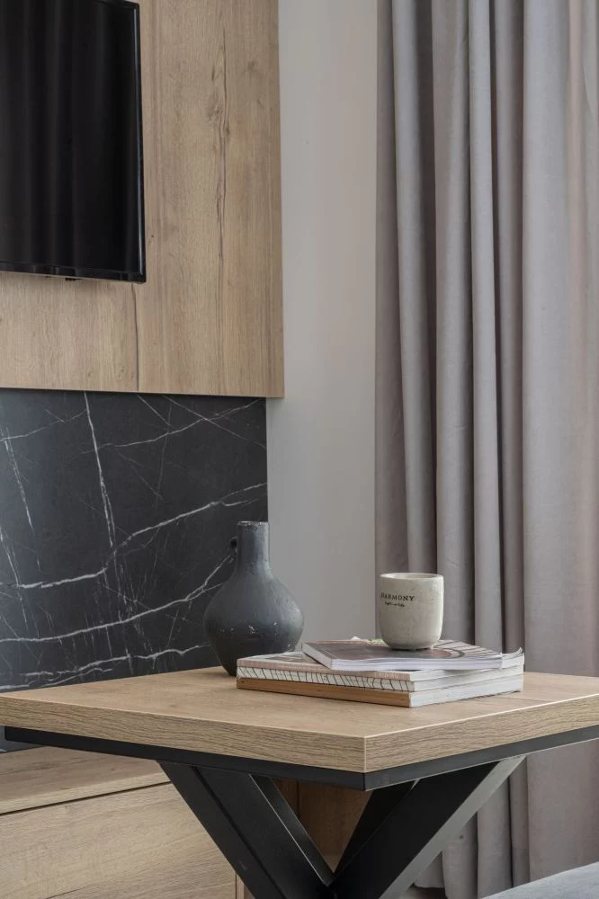Wyjątkowa aranżacja wnętrza pomogła w stworzeniu klimatycznego miejsca. Połącznie nowoczesnego stylu oraz drewnianych tradycyjnych dodatków sprawia, że apartament jest przytulny oraz funkcjonalny.