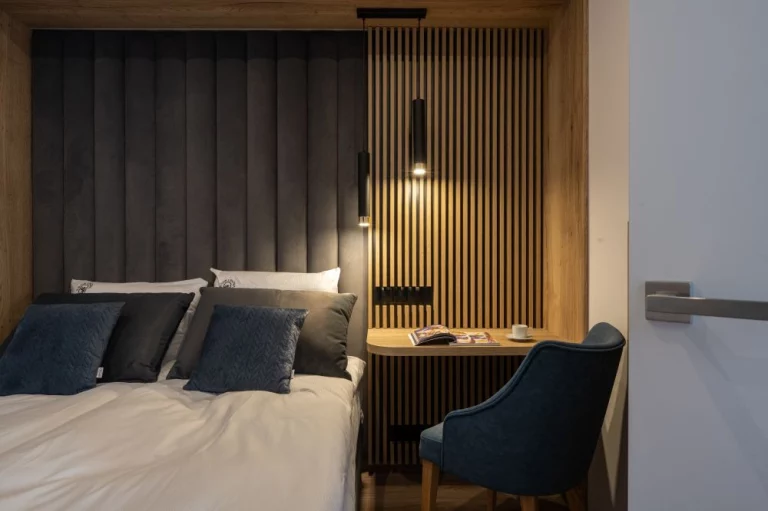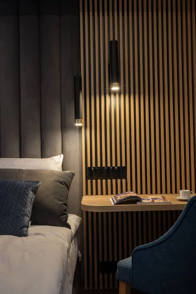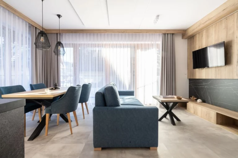 Wyjątkowa aranżacja wnętrza pomogła w stworzeniu klimatycznego miejsca. Połącznie nowoczesnego stylu oraz drewnianych tradycyjnych dodatków sprawia, że apartament jest przytulny oraz funkcjonalny.