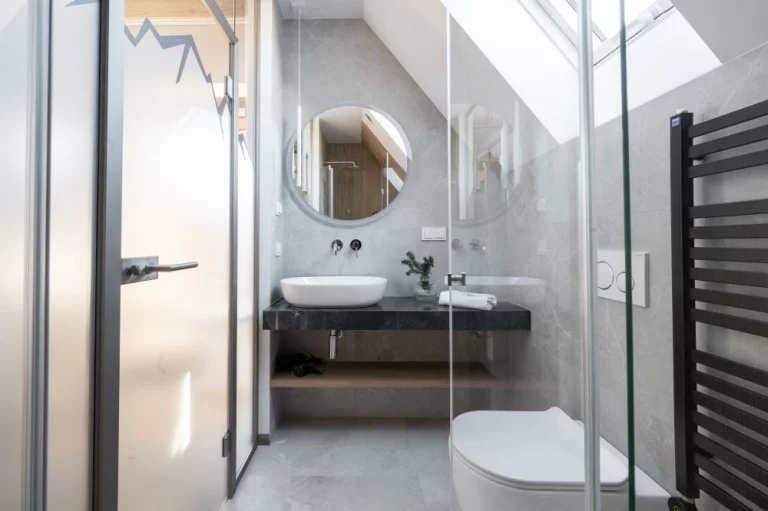 Łazienka: kabina prysznicowa, sauna, WC, umywalka, lustro, grzejnik ręcznikowiec, suszarka do włosów.