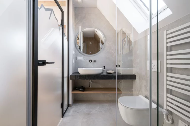 Łazienka: kabina prysznicowa, sauna, WC, umywalka, lustro, grzejnik ręcznikowiec, suszarka do włosów.