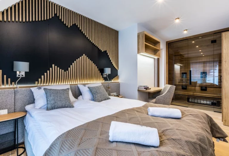 Sypialnia: sauna, łoże małżeńskie, biurko z krzesłem, szafa, TV, stoliki nocne z oświetleniem, wyjście na balkon.