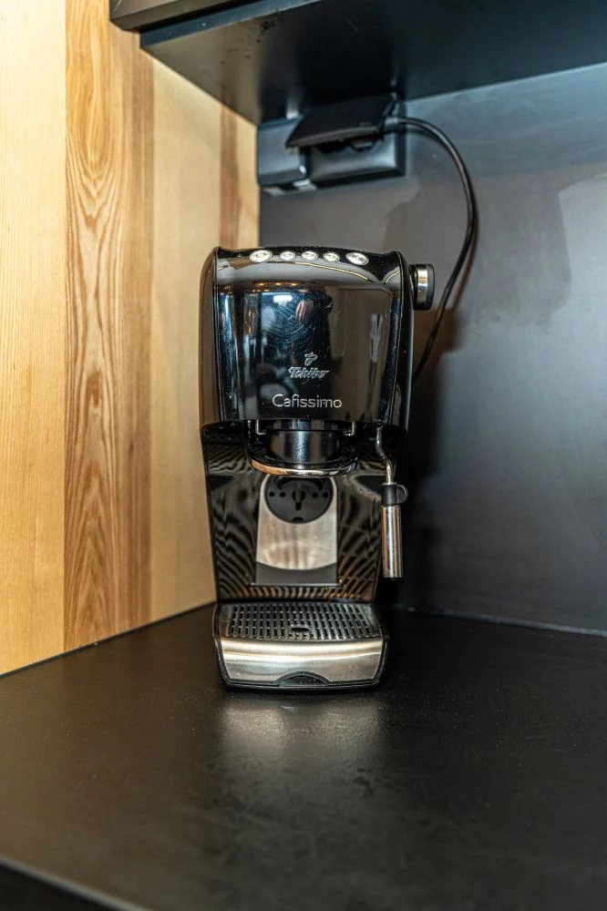 Aneks kuchenny: zabudowa kuchenna, lodówka z zamrażalnikiem, płyta indukcyjna, piekarnik, zmywarka i zlewozmywak. Wyposażony jest czajnik, kapsułkowy ekspres do kawy (Tchibo) garnki i patelnie, oraz zastawę stołową.