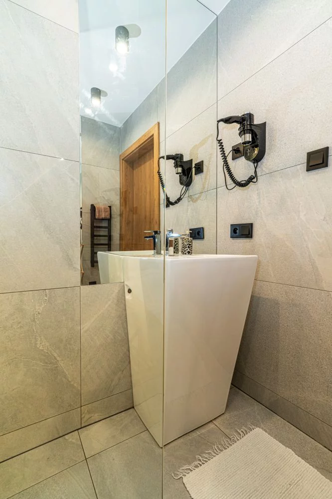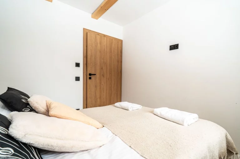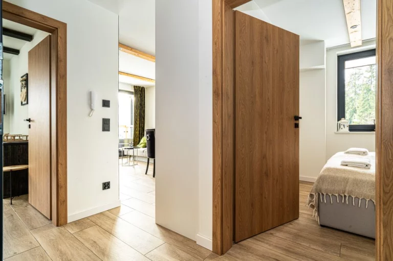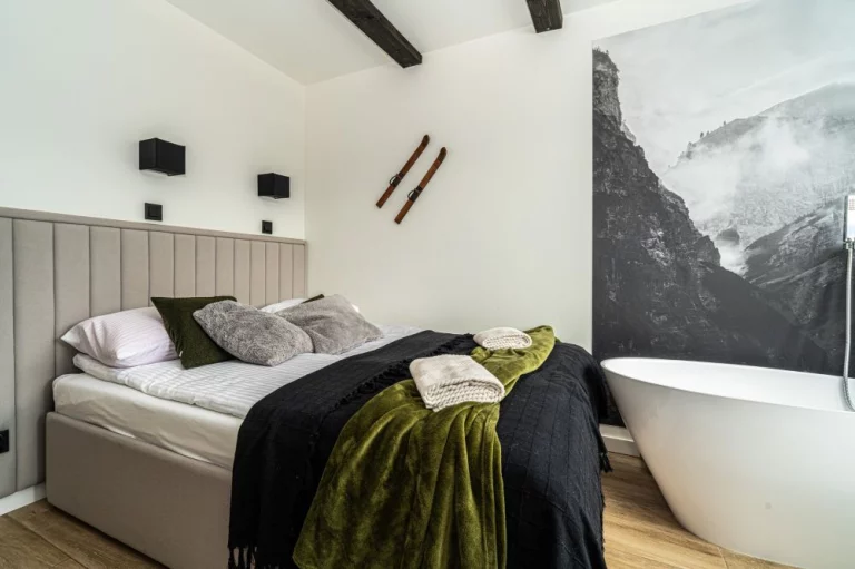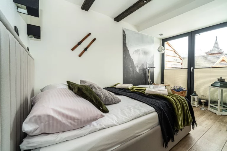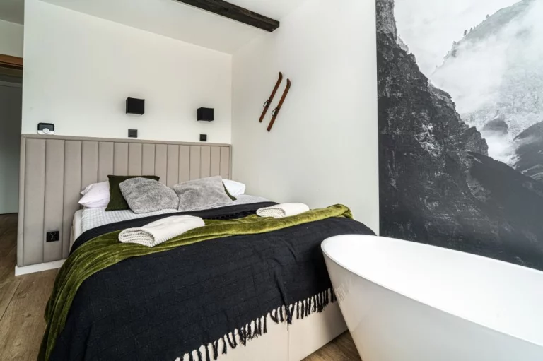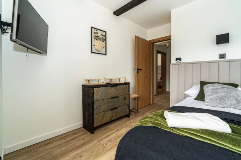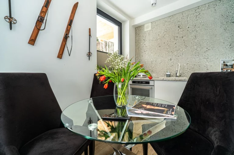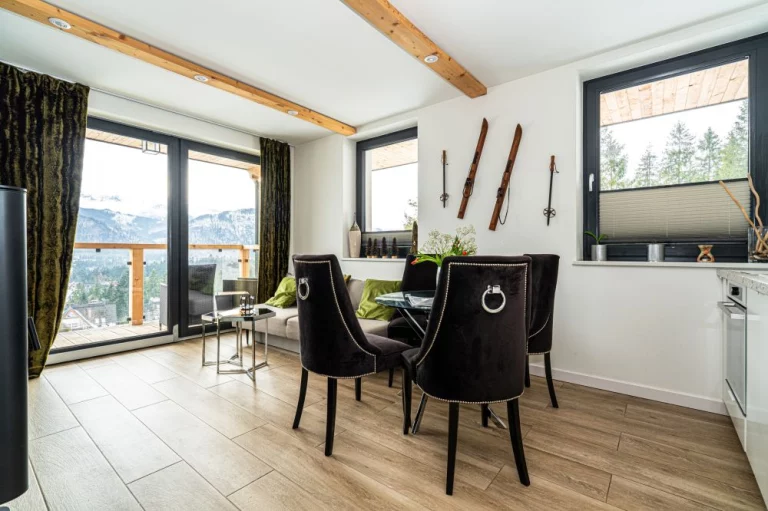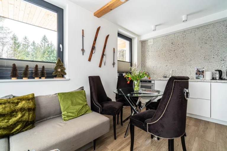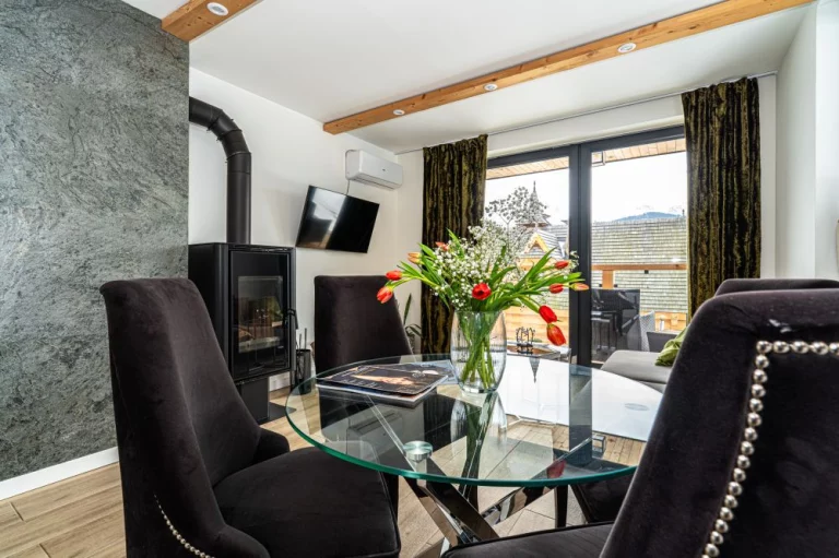 Apartament 3 znajduje się w kameralnym kompleksie Schronisko Zmysłów. Posiada panoramiczny widok na majestatyczne Tatry. Szklane balkony, naturalne drewno i kamień podkreślają inspirację otaczającym krajobrazem, a jednocześnie nadają wnętrzu elegancję i ciepło.
