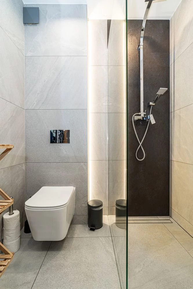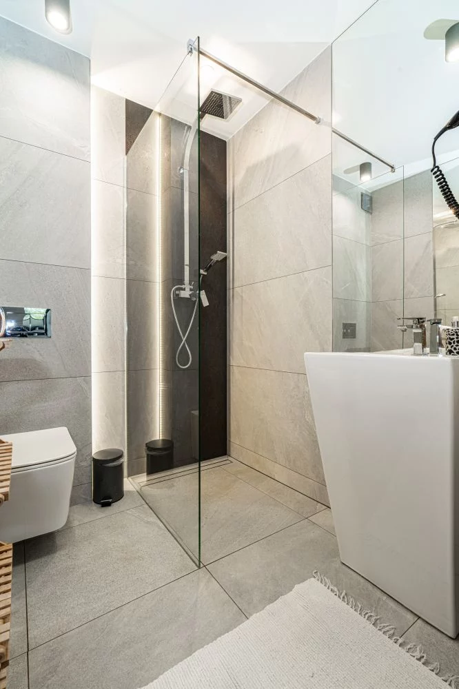 Łazienka: prysznic, toaleta, umywalka, lustro, szafka na kosmetyki, grzejnik łazienkowy, suszarka, ręczniki.