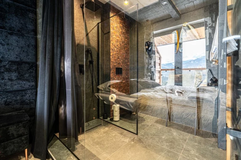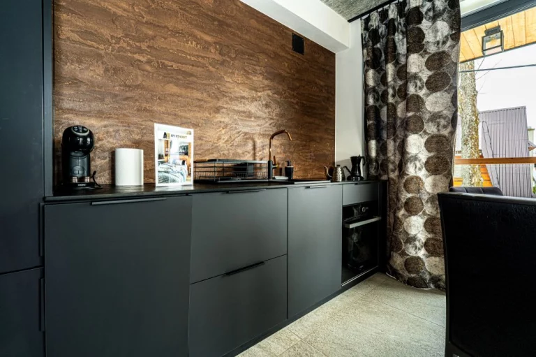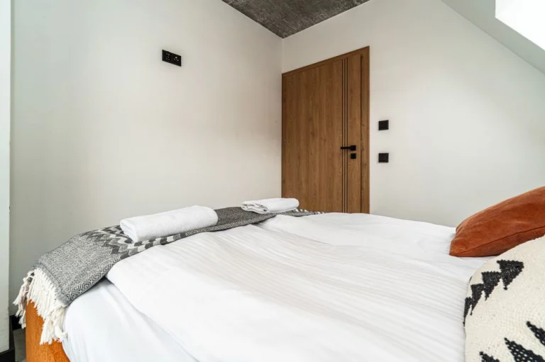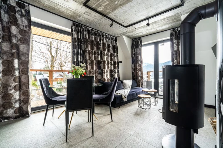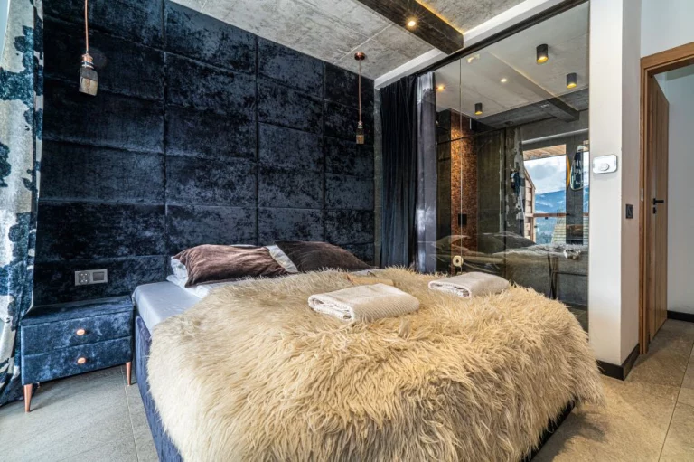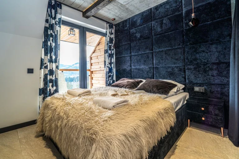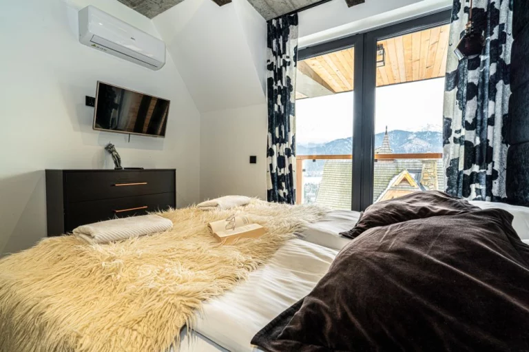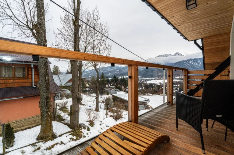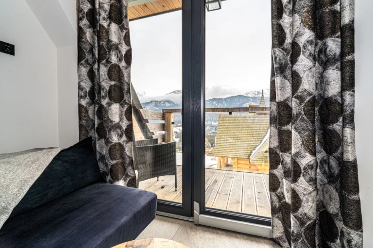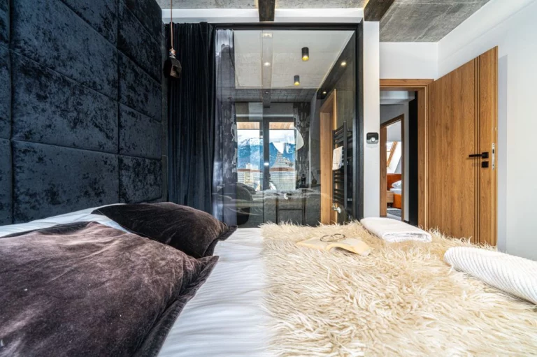 Apartament 6 znajduje się w kameralnym kompleksie Schronisko Zmysłów. Posiada panoramiczny widok na majestatyczne Tatry. Szklane balkony, naturalne drewno i kamień podkreślają inspirację otaczającym krajobrazem, a jednocześnie nadają wnętrzu elegancję i ciepło.