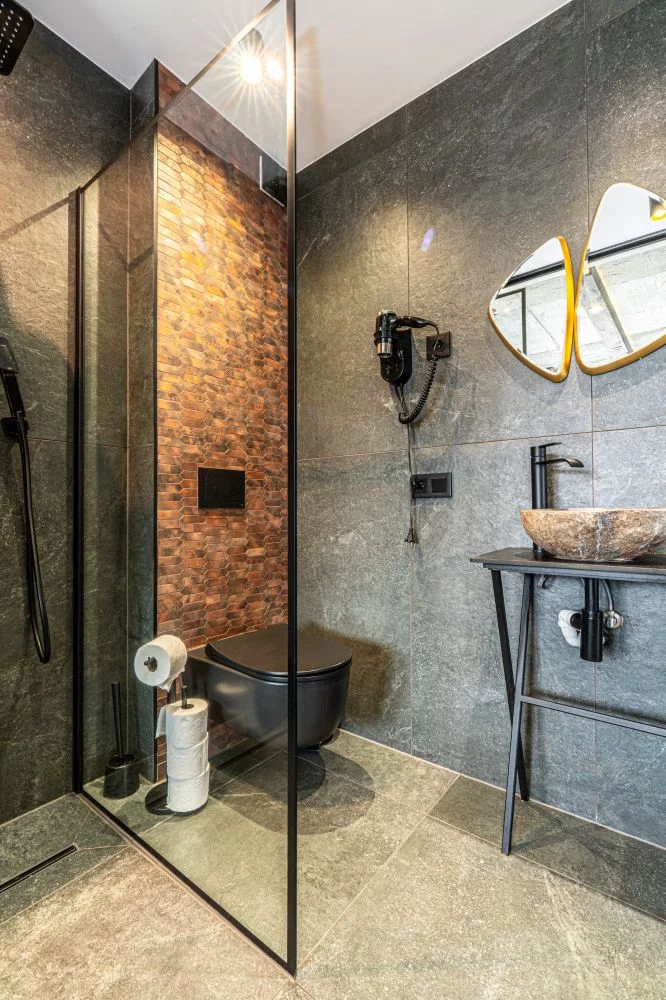 Łazienka: prysznic, toaleta, umywalka, lustro, grzejnik łazienkowy, suszarka, ręczniki.