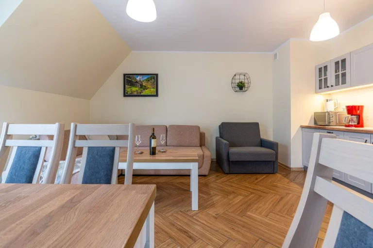 Przestronne i wygodne mieszkanie o powierzchni 60 m2 znajduje się na pierwszym piętrze, przeznaczone jest dla 2-6 osób.