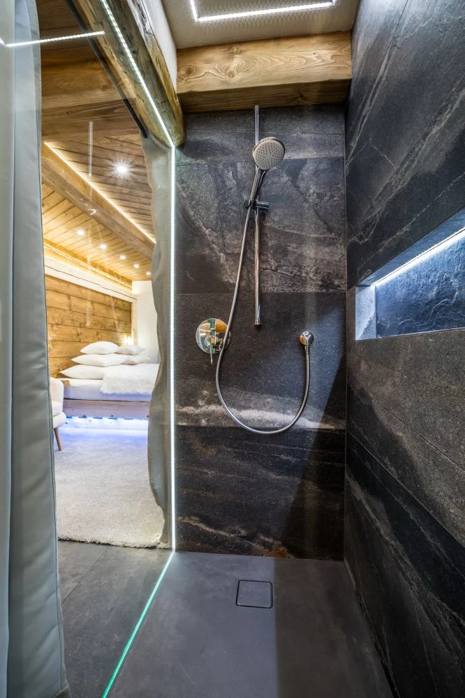 Łazienka z oświetloną kabiną prysznicową z deszczownicą, radiem oraz ogrzewaniem podłogowym.