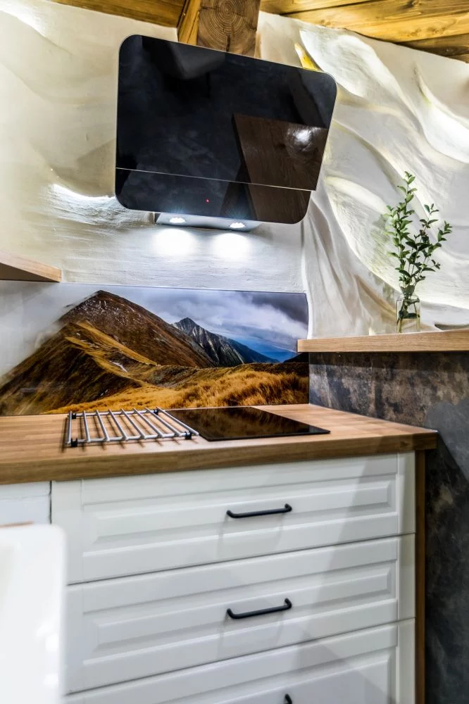 Uroczy aneks kuchenny- wyposażony w lodówkę, zmywarkę, kuchenkę indukcyjną, mikrofalówkę, czajnik elektryczny oraz wszystko czego potrzebujecie Państwo do przyrządzenia pysznych posiłków: garnki, naczynia i sztućce.