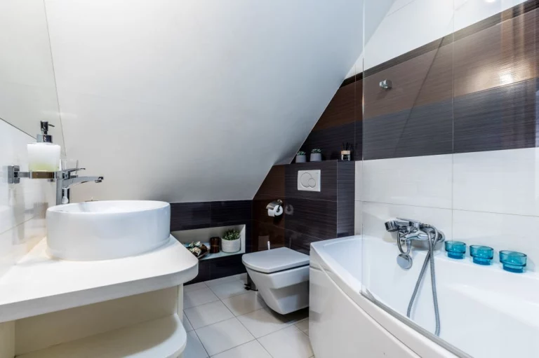 Łazienka: wanna, toaleta, umywalka, szafki, lustro, grzejnik łazienkowy, suszarka, ręczniki.
