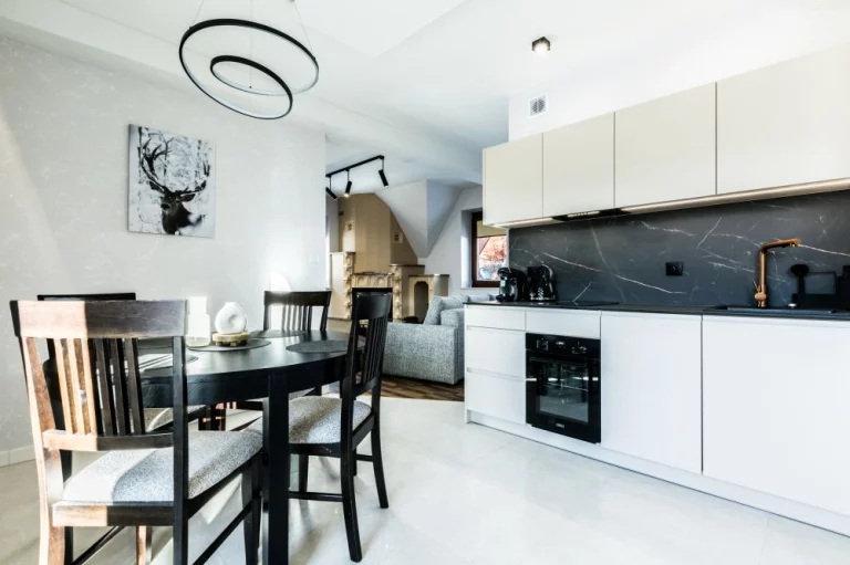 Aneks kuchenny: stół z 5 krzesłami, zabudowa kuchenna z lodówką, piekarnikiem, zlewozmywakiem, zmywarka, płytą indukcyjną . Aneks kuchenny posiada czajnik, ekspres do kawy, garnki i patelnie i zastawę stołową dla 6 osób. Wyście na balkon.
