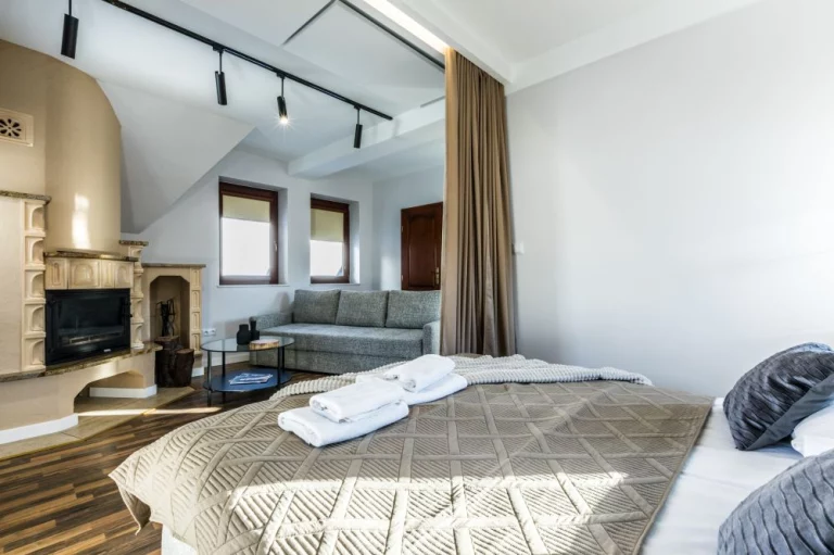 Salon: TV, rozkładana sofa dla 2 osób, kominek, stolik kawowy, łoże małżeńskie, dwa stoliki nocne z oświetleniem.