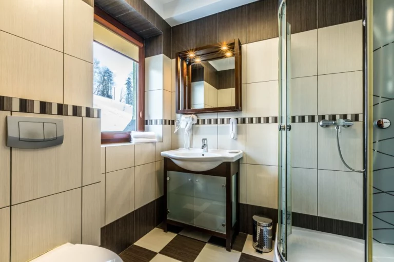 Łazienka: prysznic, toaleta, umywalka, lustro, grzejnik łazienkowy, suszarka, ręczniki.