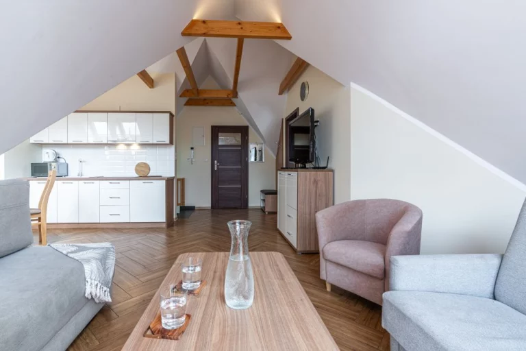 Składa się z kuchni połączonej z salonem, sypialni i łazienki z prysznicem. W salonie jest wyjście na balkon z przepięknym widokiem na Giewont.