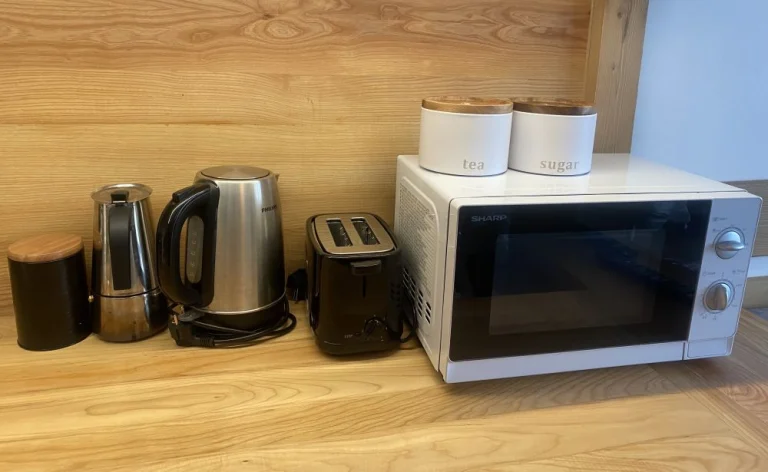 Kuchnia: zabudowa kuchenna z lodówką, płytą indukcyjną, kuchenką mikrofalową i zlewozmywakiem oraz czajnikiem, garnki i patelnie, zastawa stołowa dla 4 osób