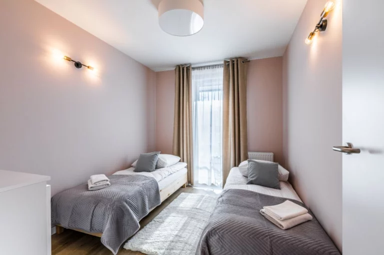 Komfortowy apartament posiada 52 m2 i składa się z salonu, kuchni, 2 sypialni, przedpokoju oraz łazienki.