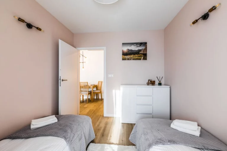 Sypialnia 2: dwa pojedyncze łóżka, komoda.
