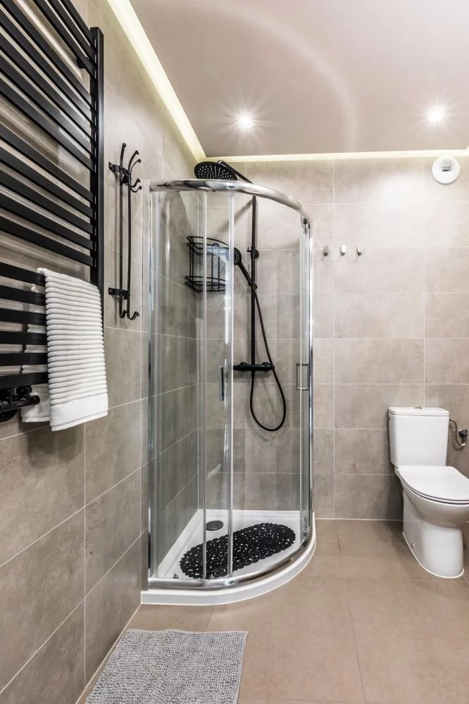 Łazienka: prysznic, umywalka z szafką, lustro, grzejnik, suszarka do włosów, ręczniki.