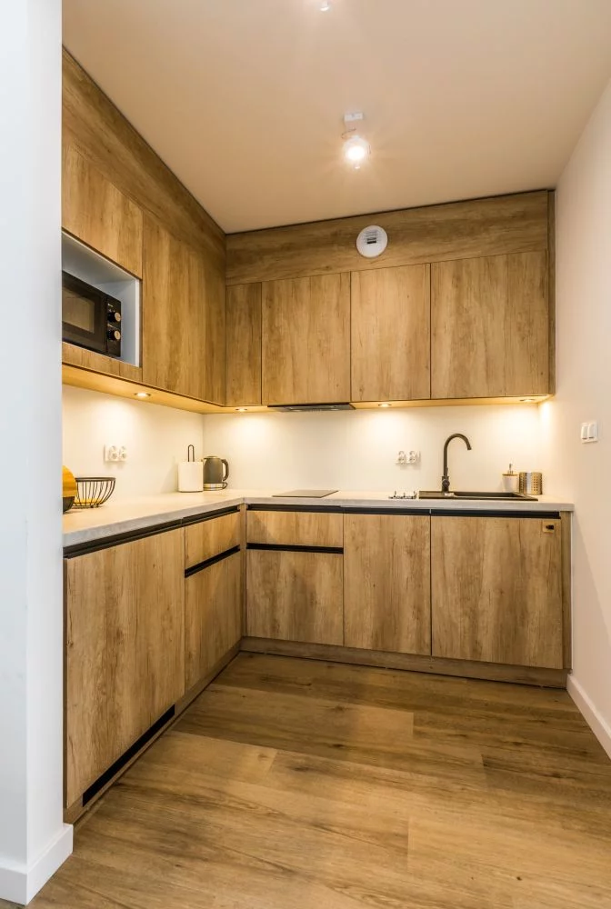 Kuchnia: nowoczesna zabudowa kuchenna, stół z czterema krzesłami, lodówka, zmywarka, mikrofalówka, płyta indukcyjna, okap, czajnik, zlewozmywak, garnki i patelnie, zastawa stołowa dla 6 osób.