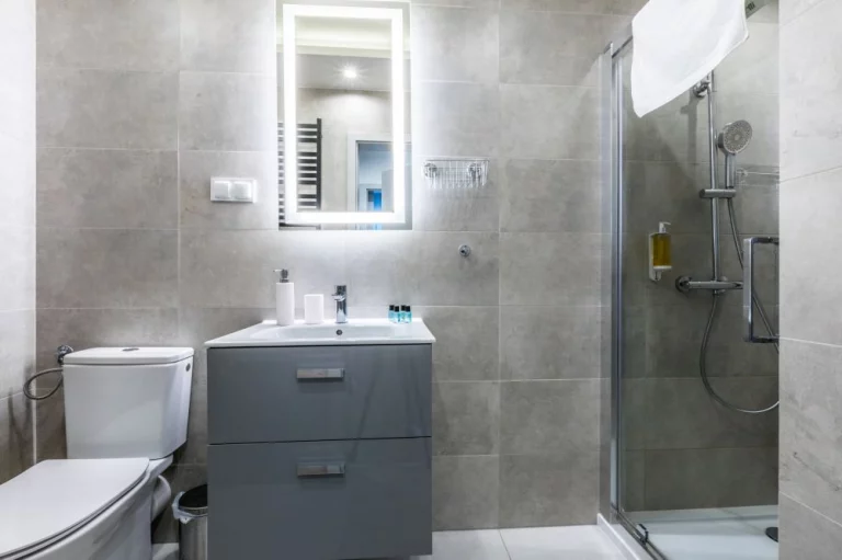 Łazienka: WC, prysznic, umywalka z szafką, lustro, grzejnik, suszarka do włosów, ręczniki.