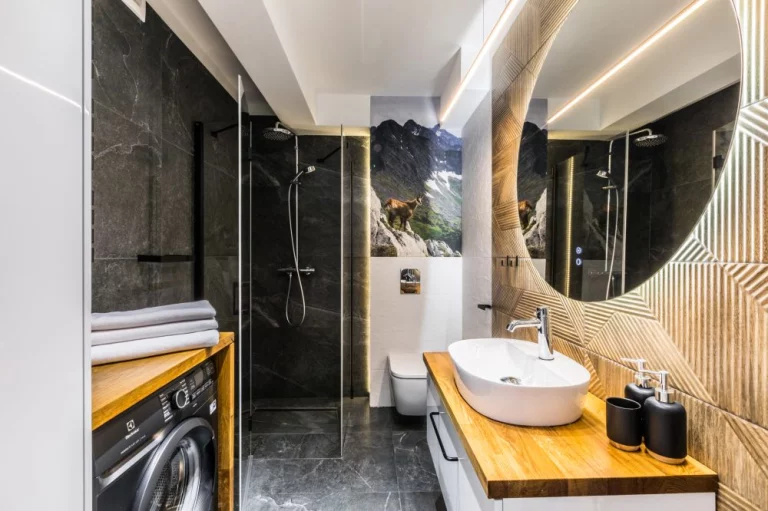 Łazienka: prysznic, toaleta, umywalka, szafka, lustro, grzejnik łazienkowy, suszarka, pralka, ręczniki.