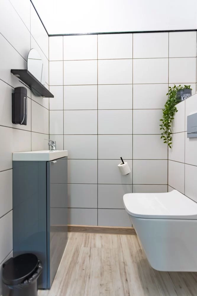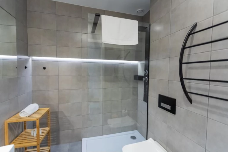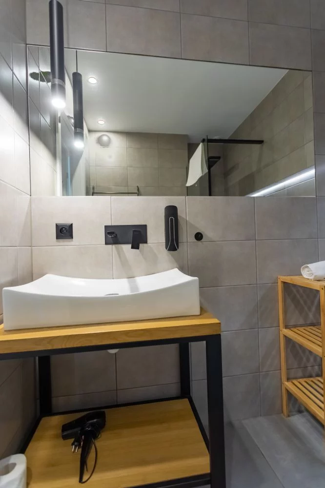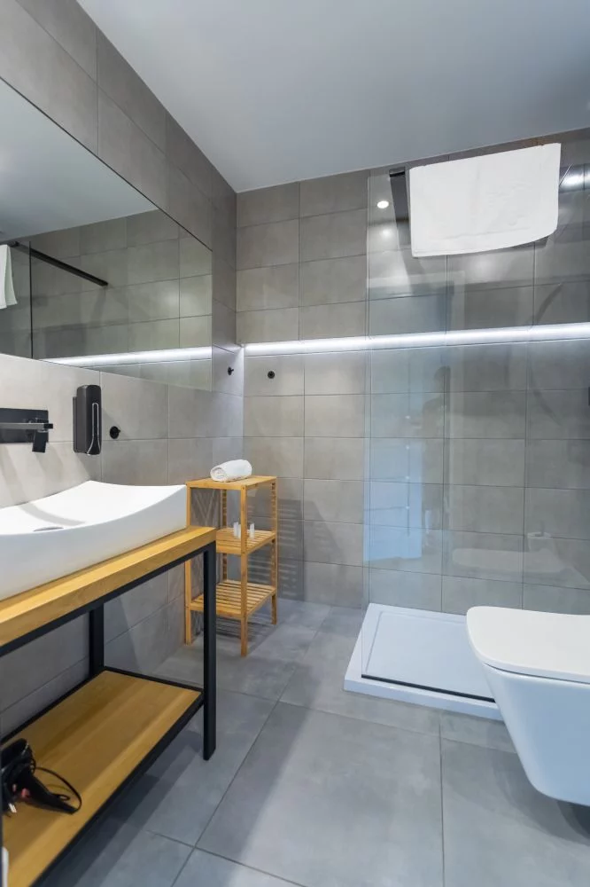 Łazienka: kabina prysznicowa, toaleta, umywalka, lustro, grzejnik, ręczniki, suszarka do włosów.