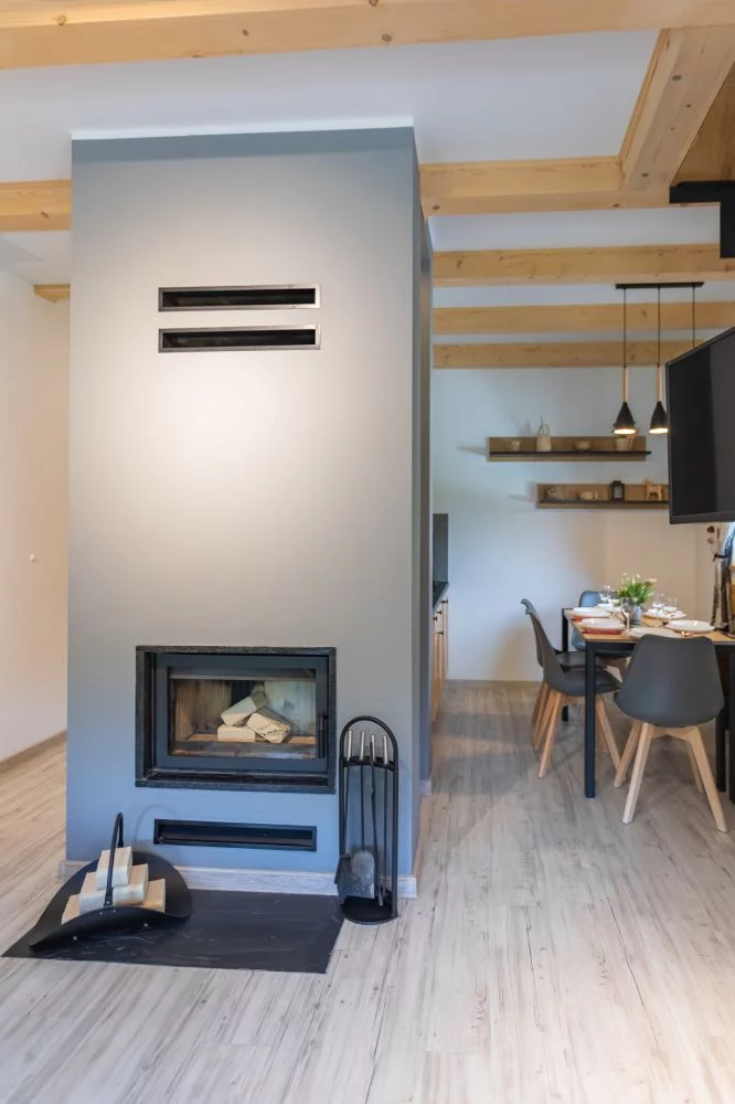 Salon: stół z 4 krzesłami, rozkładana kanapa, stolik kawowy i TV, kominek (dodatkowy brykiet płatny)